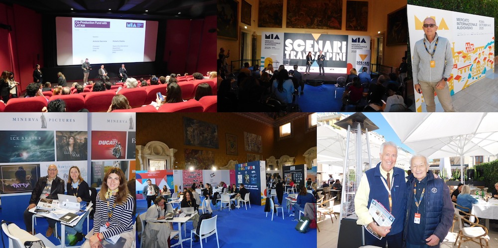 Pictured above (top l. to r.): Co-production Fund with LatAm conference; Scenari Transalpini (Over the Alps Opportunities) conference; RAI’s Andrea Portante; TVCO’s Vincenzo Mosca with Minerva’s Monica Ciarli and Bianca Giacalone; one of the many exhibition floors; VideoAge‘s Dom Serafini, Italian film-TV consultant Giuseppe Proietti.